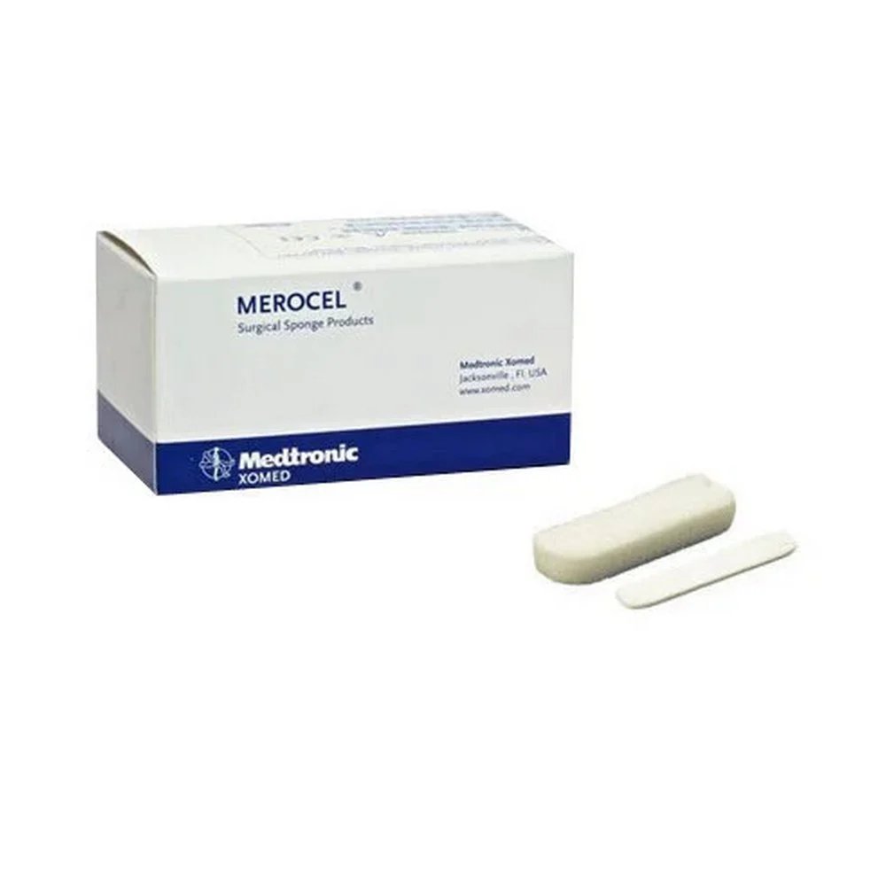 Мероцел назальные тампоны 8см (Merocel )послеоперационный или анатомический назальный тампон длиной 8 см, разработанный компанией Merocel, который используется в оториноларингологии для тампонады полости носа после хирургических вмешательств, таких как септопластика, ринопластика и конхэктомия. Тампоны Merocel изготавливаются из пористого материала, который расширяется и принимает форму полости носа, обеспечивая бережную и надежную фиксацию.  Это сжатая, дегидратированная губка, которая расширяется при регидратации, оказывая давление для остановки кровотечения или поддержки трансплантатов.